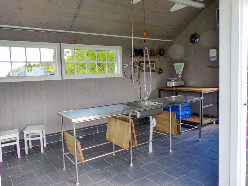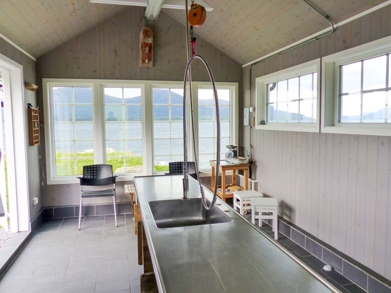 Das in der roten Häuserreihe vom Wasser aus gesehen rechte Haus präsentiert sich renoviert und modern eingerichtet seinen Gästen. Ein mit Polstermöbeln und Flachbildfernseher behaglich ausgestatteter Wohnraum bietet durch eine große Fensterfront einen traumhaften Blick auf den Fjord. Von hier…