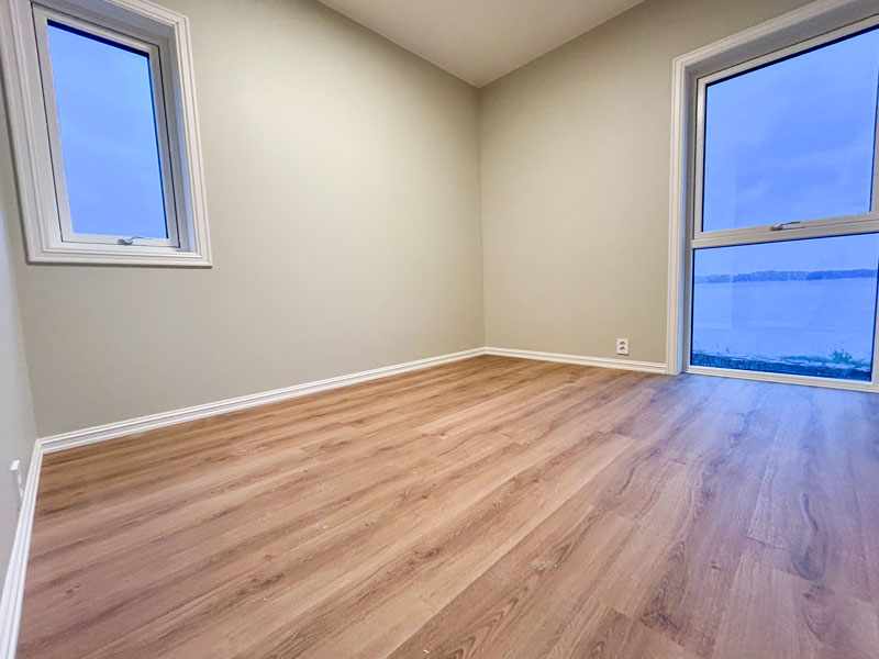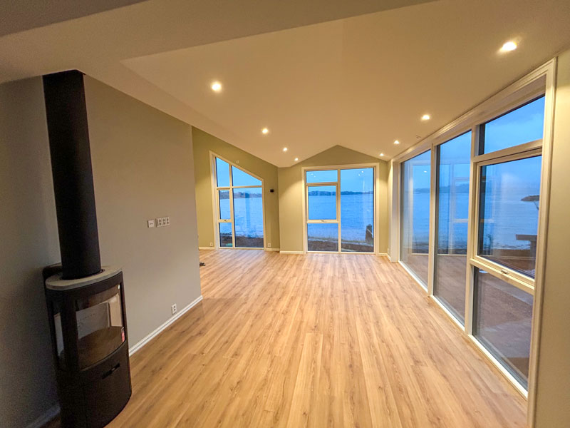Das größere der beiden Apartments befindet sich im Obergeschoss des Hauses. Auch hier lassen große Fensterfronten viel Licht in die Räume und ermöglichen einen grandiosen Blick auf das Wasser.
